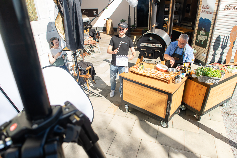 Zielgruppe des MERKLINGER Ofens sind private Grillbegeisterte, Backliebhaber*innen und Familienköch*innen. Doch auch im professionellen Gastronomiebereich findet dieses besondere Gerät vielfachen Einsatz. Daher galt es bei der Wahl der bildlichen Komponente, einen hochwertigen, aber nicht übertriebenen Look zu kreieren. Ein modernes Setup mit angenehm konsumierbaren Inhalten sollte im Vordergrund stehen. Durch ein schmales Kamera- und Lichtsetup sind wir vor allem zwei Dinge: Mobil und flexibel. So ist kein ausladendes Filmset notwendig, sondern auch in kleineren Hinterhöfen, Eingangsbereichen oder Gartenteilen sehr gut einsetzbar. Und innerhalb ein bis zwei Stunden steht das komplette Setup drehfertig bereit.