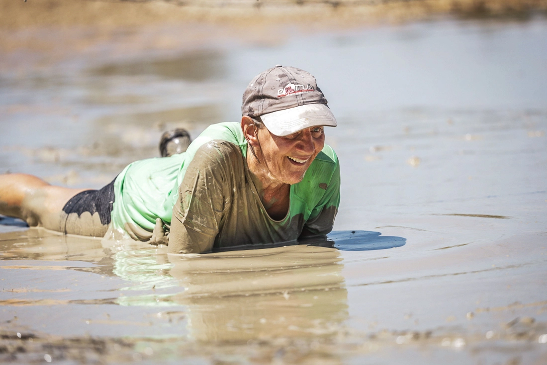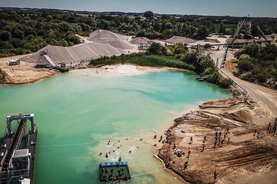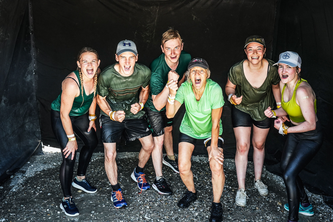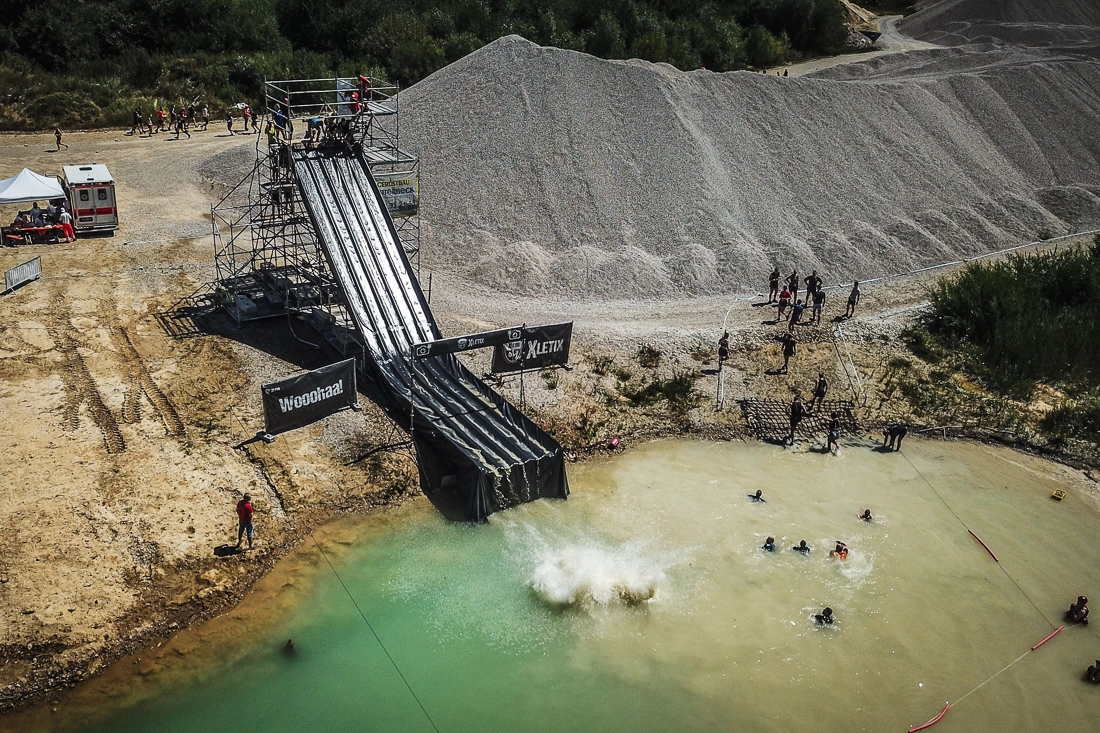 Wir mussten durch Wasserbecken mit Eiswürfeln tauchen, unter Stacheldraht durch den Matsch robben, Wände und Rampen erklimmen und noch so einiges mehr – über Wasser – unter Wasser – durch Wasser, bis wir endlich vor unserem sehnlich erwarteten Highlight standen: Die „Speed Slide“ – eine 20m hohe, 40m lange Rutsche die die Läufer*innen mit ordentlich Tempo in den See schießt. Danach waren nur noch 4 Hindernisse zu bewältigen, bis wir mit einem riesigen Freudensprung glücklich und stolz im Ziel ankamen.
