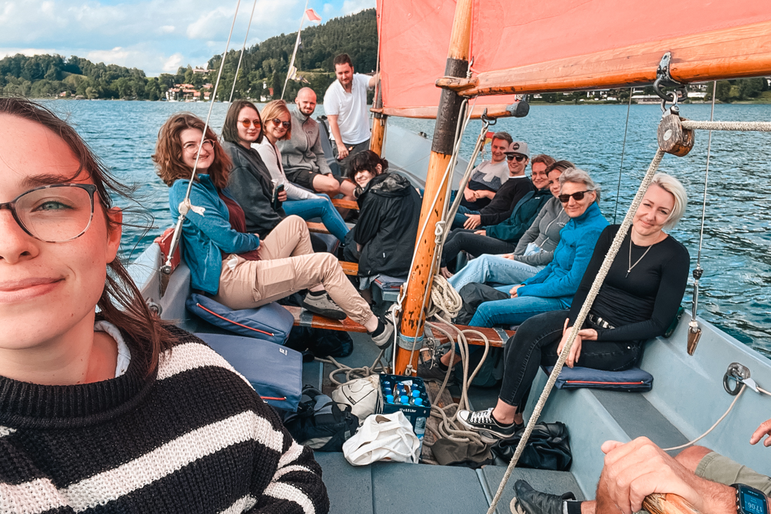 Hungrig von der Besichtigung kehrten wir im Fabrikrestaurant Mangfallblau ein. Dieses Restaurant ist nicht nur ein Treffpunkt für Kreative, sondern überzeugt auch durch seine frische, lokale und gesunde Küche. Bei einem leckeren Mittagessen konnten wir entspannen und die angenehme Atmosphäre genießen. Gestärkt ging es anschließend weiter zum Tegernsee, wo wir eine Segeltour unternahmen. Auf dem glitzernden Wasser des Tegernsees erfuhren wir von unserem Skipper allerlei Interessantes über die Geschichte des Sees und die berühmten Persönlichkeiten, die hier ihre Villen haben. Die entspannte Segeltour bot eine willkommene Gelegenheit, die Natur zu genießen und den Alltag hinter uns zu lassen.